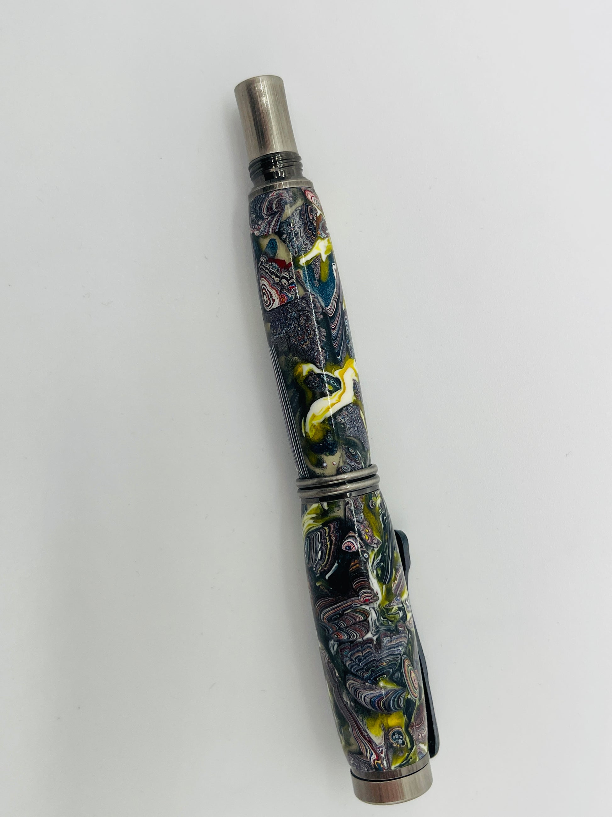 This exquisite pen is crafted from Fordite, also known as "Detroit Agate" or "Motor City Agate," a unique material formed from layers of automotive paint in factories. The intricate colors evoke a mesmerizing, geological feel, while resembling dragon scales. Polished to perfection, the Fordite layers reveal a history of vibrant automotive colors, making this pen a true piece of art with an industrial heritage. With its unique appearance and luxurious antique silver accents, this pen is a one-of-a-kind treasure for collectors and writing enthusiasts alike.