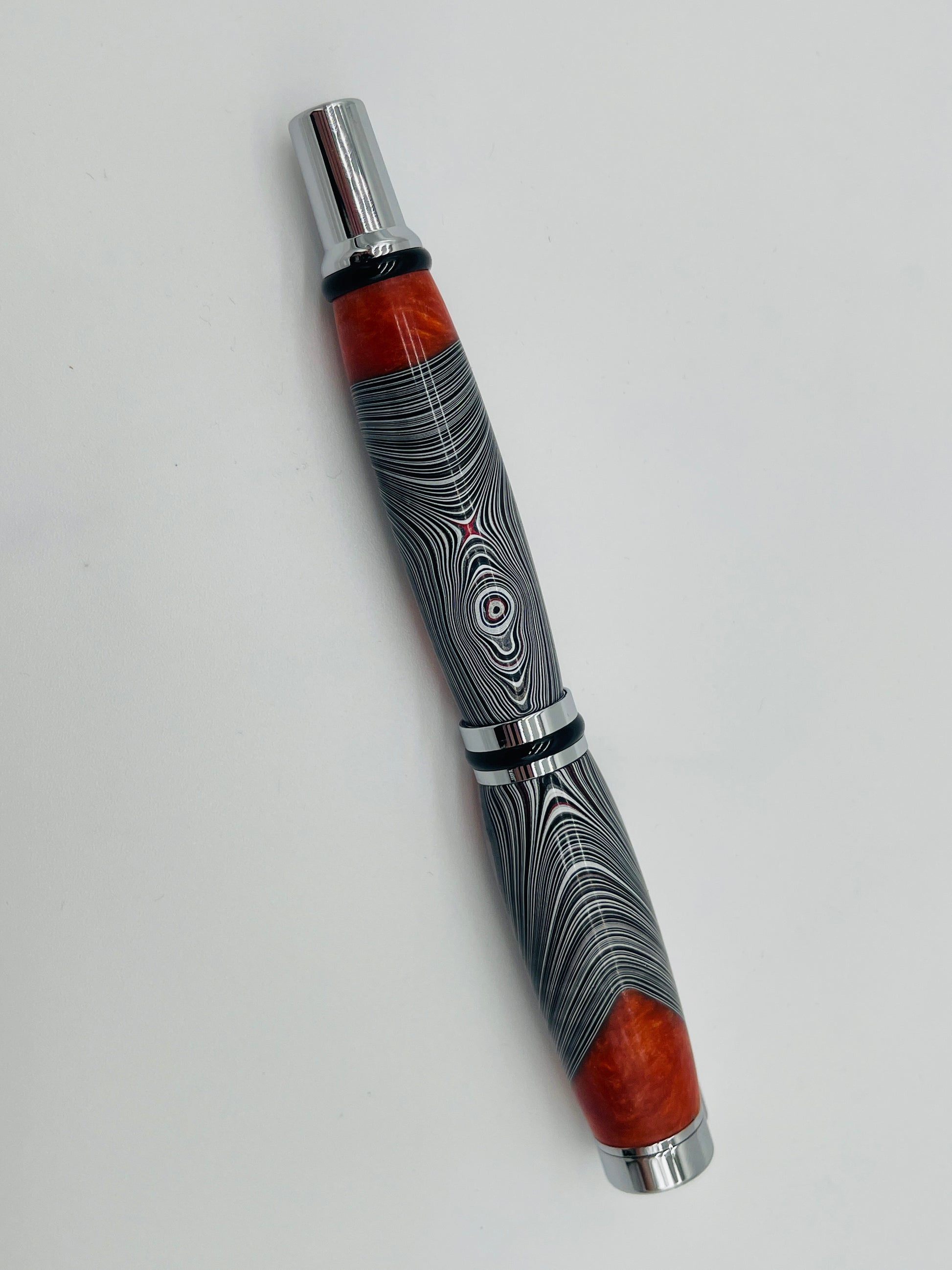 This exquisite pen is crafted from Fordite, also known as "Detroit Agate" or "Motor City Agate," a unique material formed from layers of automotive paint in factories. The intricate patterns of black, white, and red swirls evoke a mesmerizing, geological feel, while rich orange accents on each end provide a warm contrast. Polished to perfection, the Fordite layers reveal a history of vibrant automotive colors, making this pen a true piece of art with an industrial heritage. With its unique appearance and luxurious chrome accents, this pen is a one-of-a-kind treasure for collectors and writing enthusiasts alike.