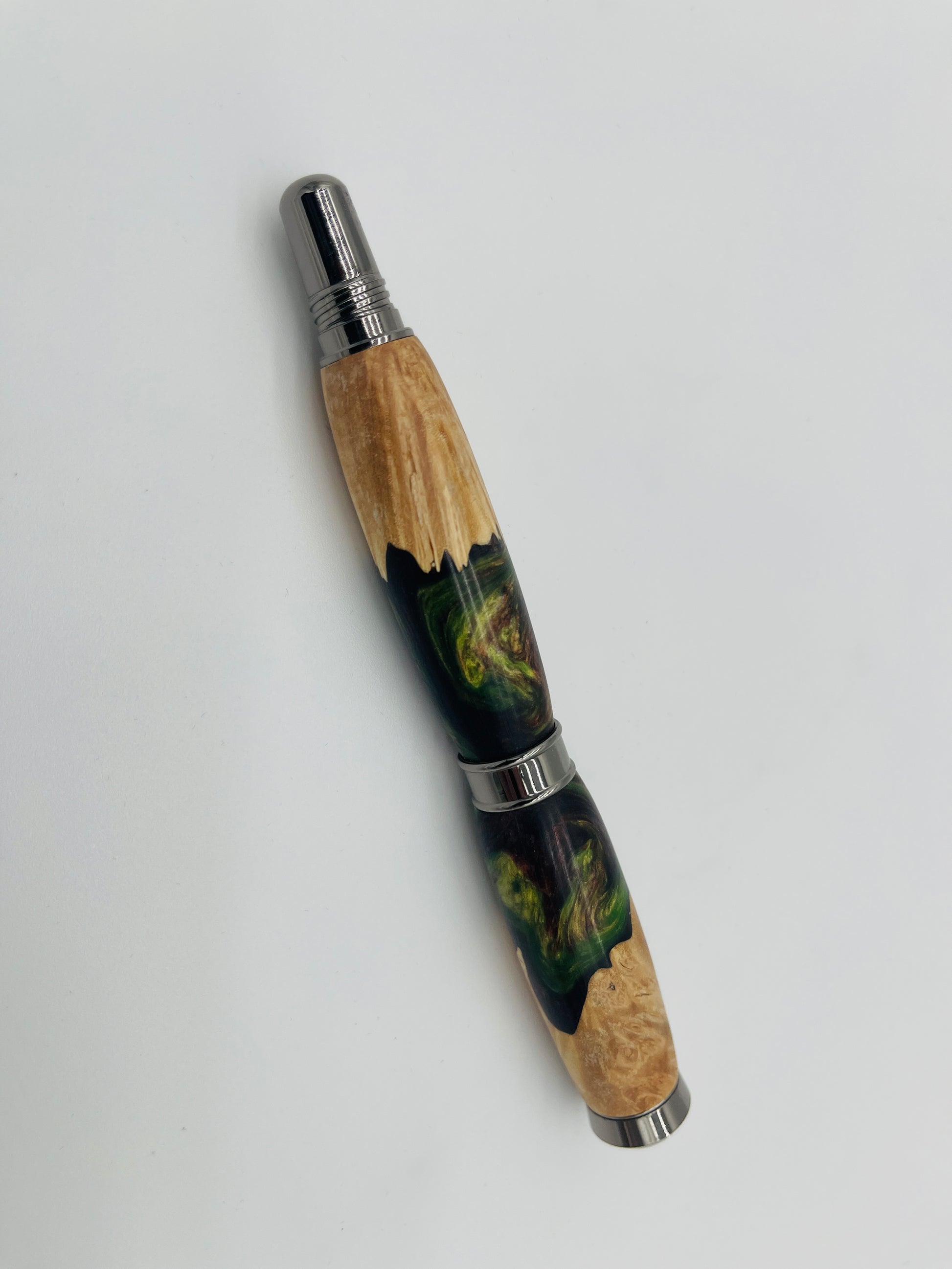 This handcrafted pen combines natural wood with bold colors, creating a striking contrast between the earthy tones of the burl wood and the deep, swirling greens and blacks of the resin. The organic, raw edges of the wood blend seamlessly with the glossy resin, giving it an artful, rustic appeal. This pen is both a practical tool and a statement piece, reflecting the beauty of natural materials enhanced by artisanal craftsmanship.
