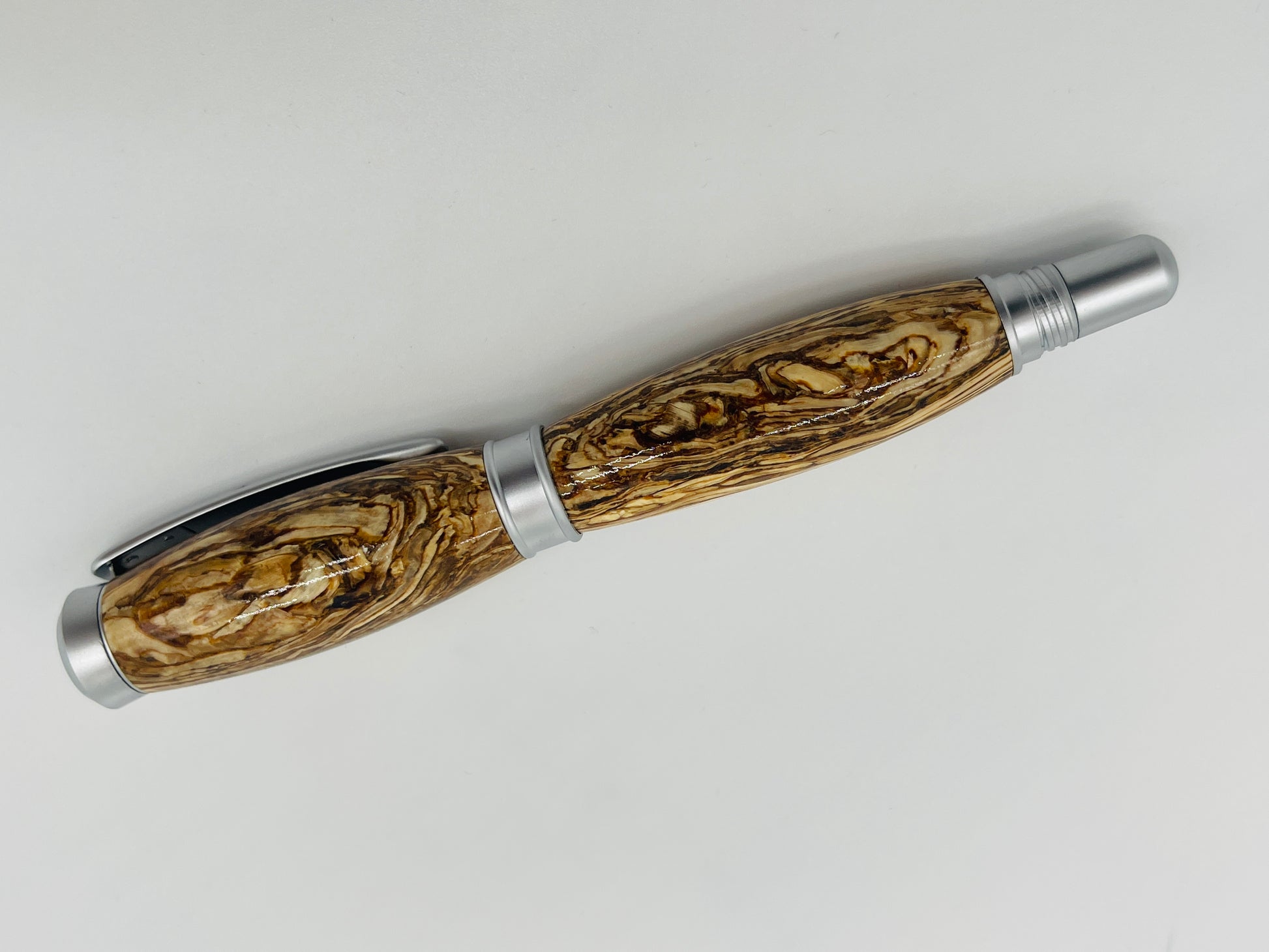 This unique pen is crafted from hemp wood, showcasing a captivating natural grain pattern with intricate swirls and rich, earthy tones. The warm hues of the hemp wood are complemented by satin-finished silver accents, creating a perfect blend of rustic charm and modern elegance. Each pen is uniquely patterned, making it a one-of-a-kind writing instrument for those who appreciate sustainable materials and organic beauty. Ideal for both everyday use and special occasions, this pen brings a touch of nature’s artistry to your collection.