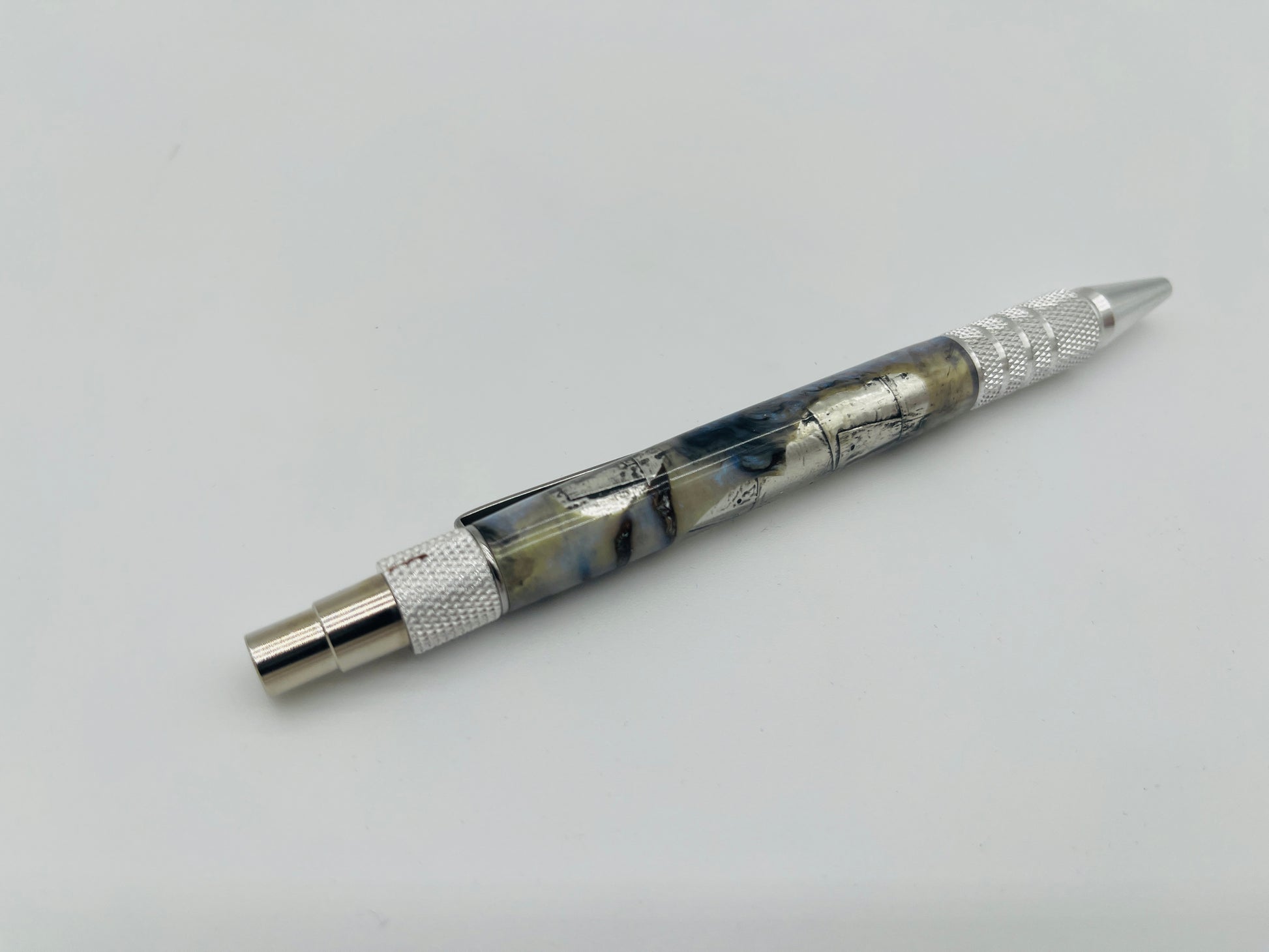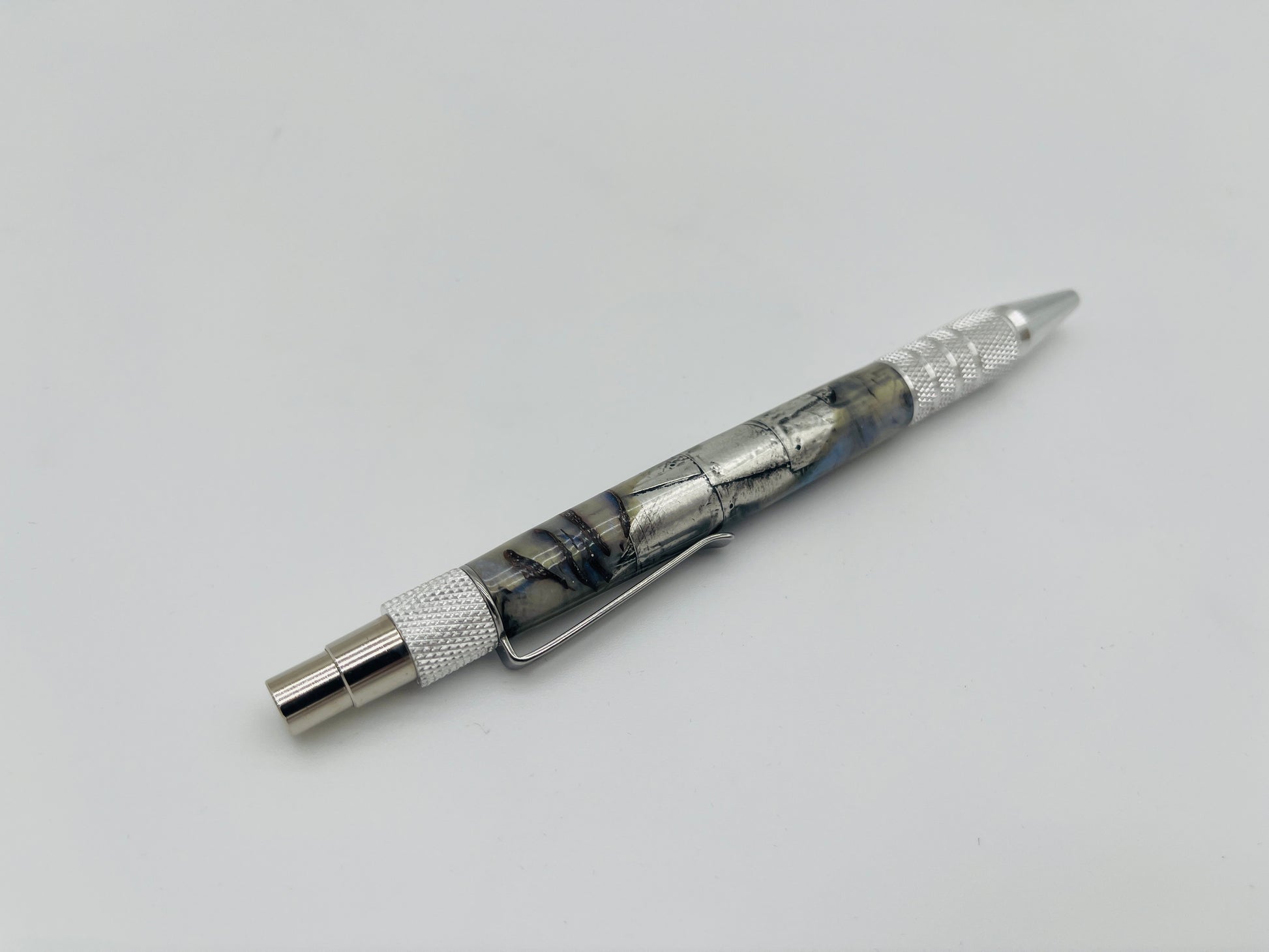 This pen has a sleek, industrial aesthetic, featuring a aluminum body with a unique segmented pattern that resembles the exterior of an aircraft or machinery. The barrel has a silver and gunmetal tone, displaying swirls of dark lines that add depth and texture. The knurled grip and end cap provide a sturdy, mechanical feel, complementing the pen's robust appearance. This design is ideal for those who appreciate minimalist, mechanical-inspired objects, combining utility and artistic appeal.