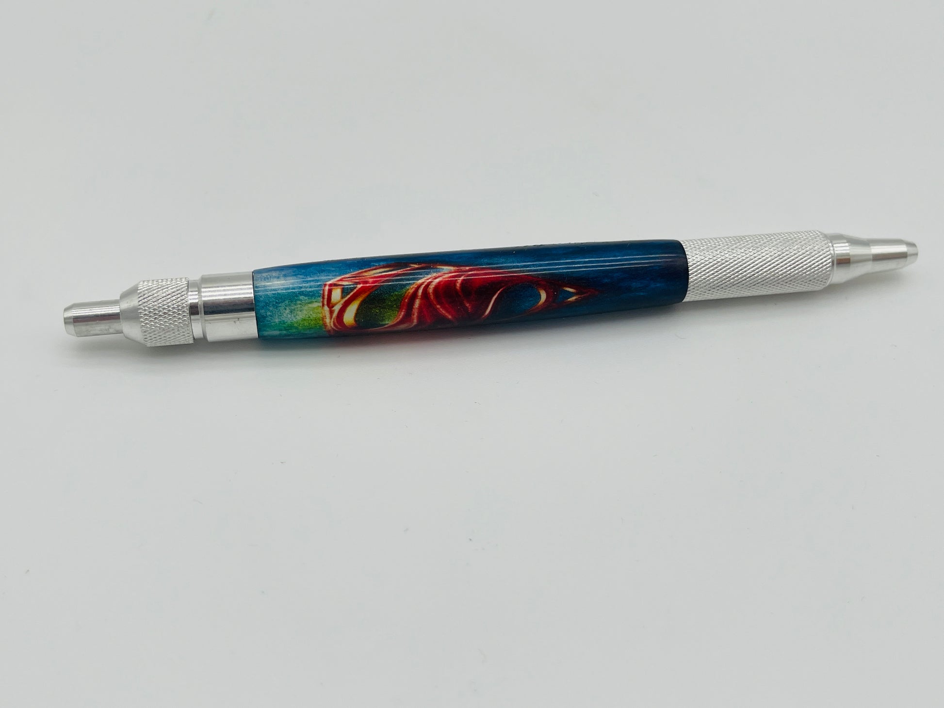 This bold and vibrant pen is a true fusion of art and functionality. The barrel features a the logo of "The Man of Steel". Each end is fitted with knurled aluminum grips, adding a rugged, industrial touch. Ideal for those who appreciate a unique design with a tactile feel, this pen is as enjoyable to hold as it is to look at. Perfect for adding a pop of color and personality to your writing collection.