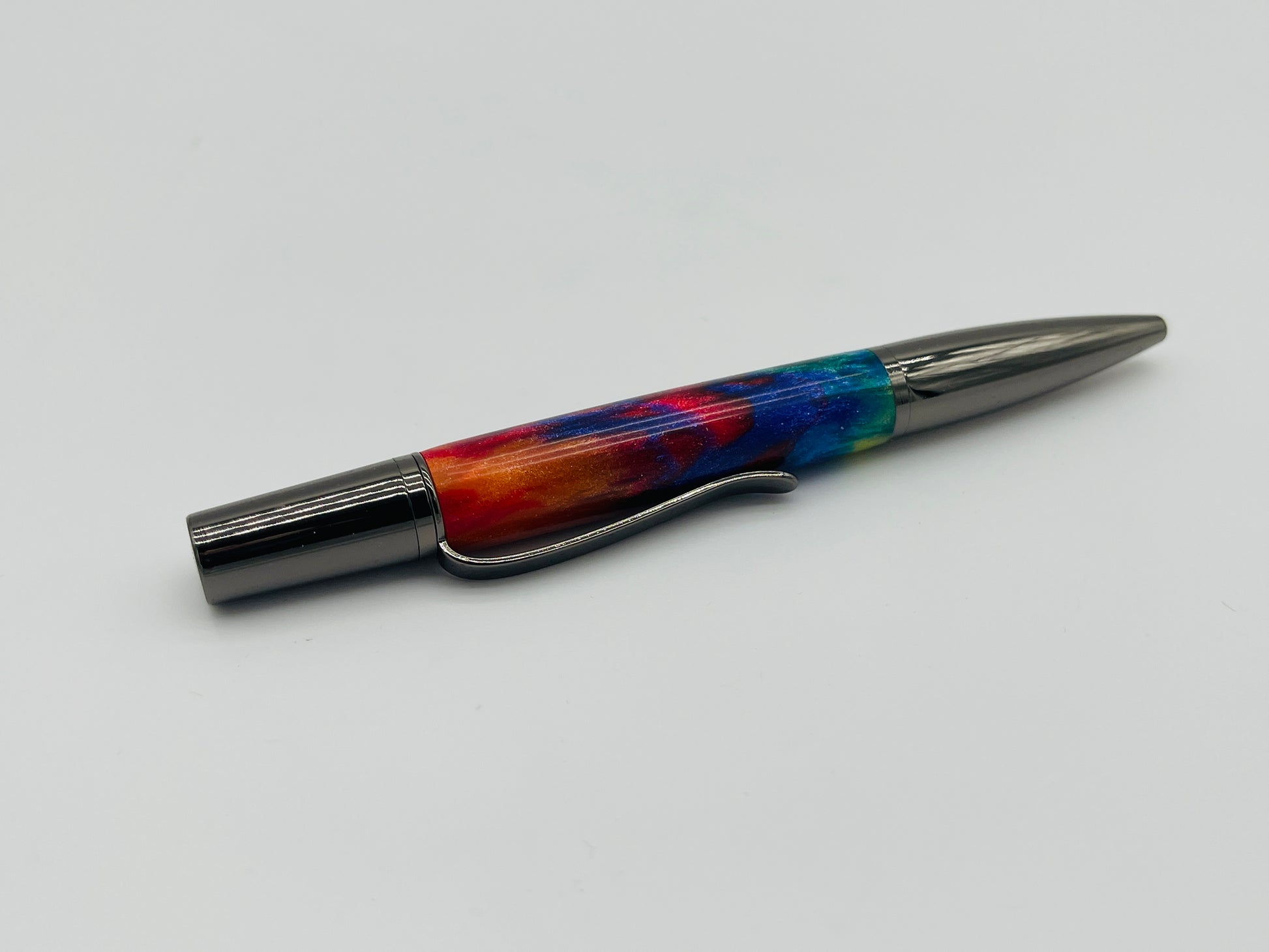 Add a burst of color to your writing with this vibrant handcrafted pen, featuring a stunning rainbow body infused with real diamond dust. Each pen is uniquely designed with swirling colors making it a true work of art. The bold, colorful body is complemented by gunmetal accents, adding a sleek, modern touch to its lively design. Perfectly balanced for a smooth writing experience, this pen is as eye-catching as it is functional. Ideal for those who appreciate creativity and uniqueness, this pen is sure to brighten up your day or make a memorable gift.
