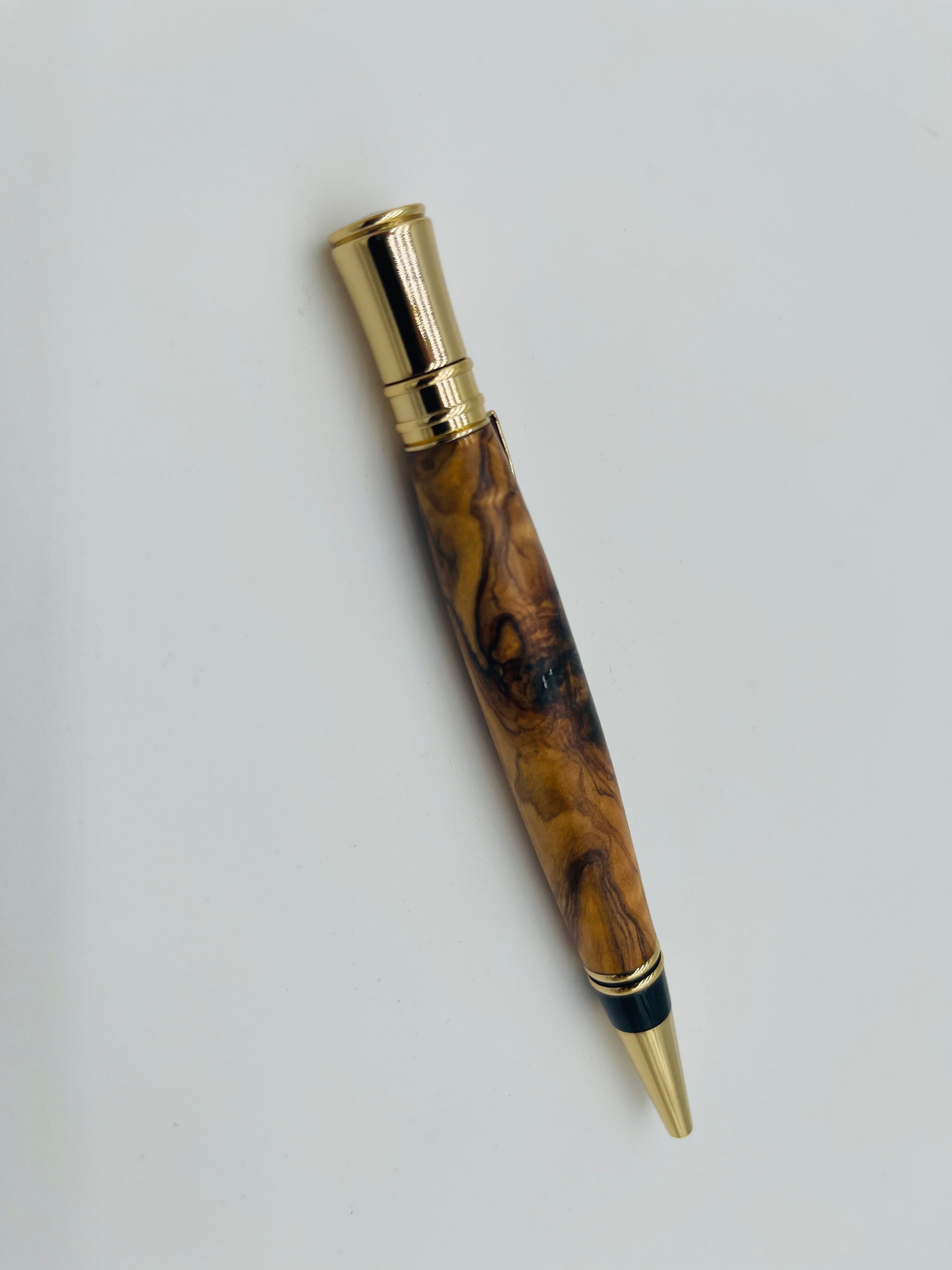This pen features a beautifully grained wooden body, complemented by luxurious gold hardware. The olive wood exhibits natural swirls and patterns, giving the pen a rich and organic look. The smooth, polished finish brings out the depth in the wood’s texture, making this pen both a functional writing instrument and a piece of art. The gold accents on the cap and tip add a touch of sophistication, ideal for someone who appreciates refined elegance in their everyday accessories.