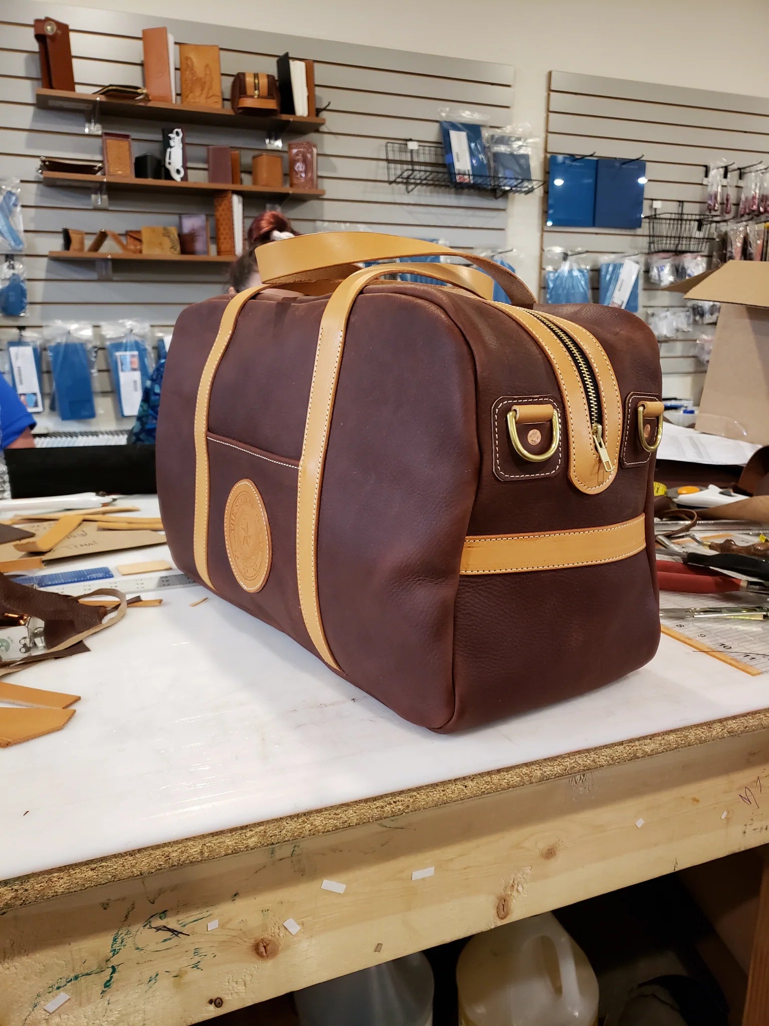 Looking for an overnight bag? Custom order yours today! Pick the color/type of leather, hardware, and thread color to have a bag of your dreams. Photo is an example by Maker's Leather Supply.