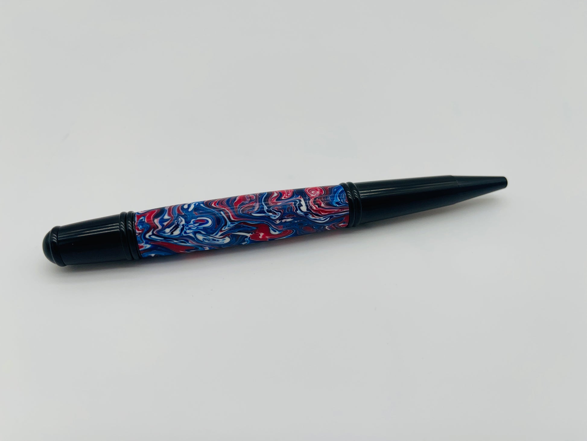 Add a splash of color to your writing with this vibrant, handcrafted pen featuring a mesmerizing swirl of red, blue, and white resin. Each pattern is uniquely crafted, ensuring no two pens are exactly alike. The glossy finish and sleek black accents bring out the vivid marbling, making this pen a true standout. Perfectly balanced for smooth writing, it’s as functional as it is visually striking. Ideal for those who appreciate bold designs, this pen is a perfect accessory for adding personality to your daily writing or as a distinctive gift.