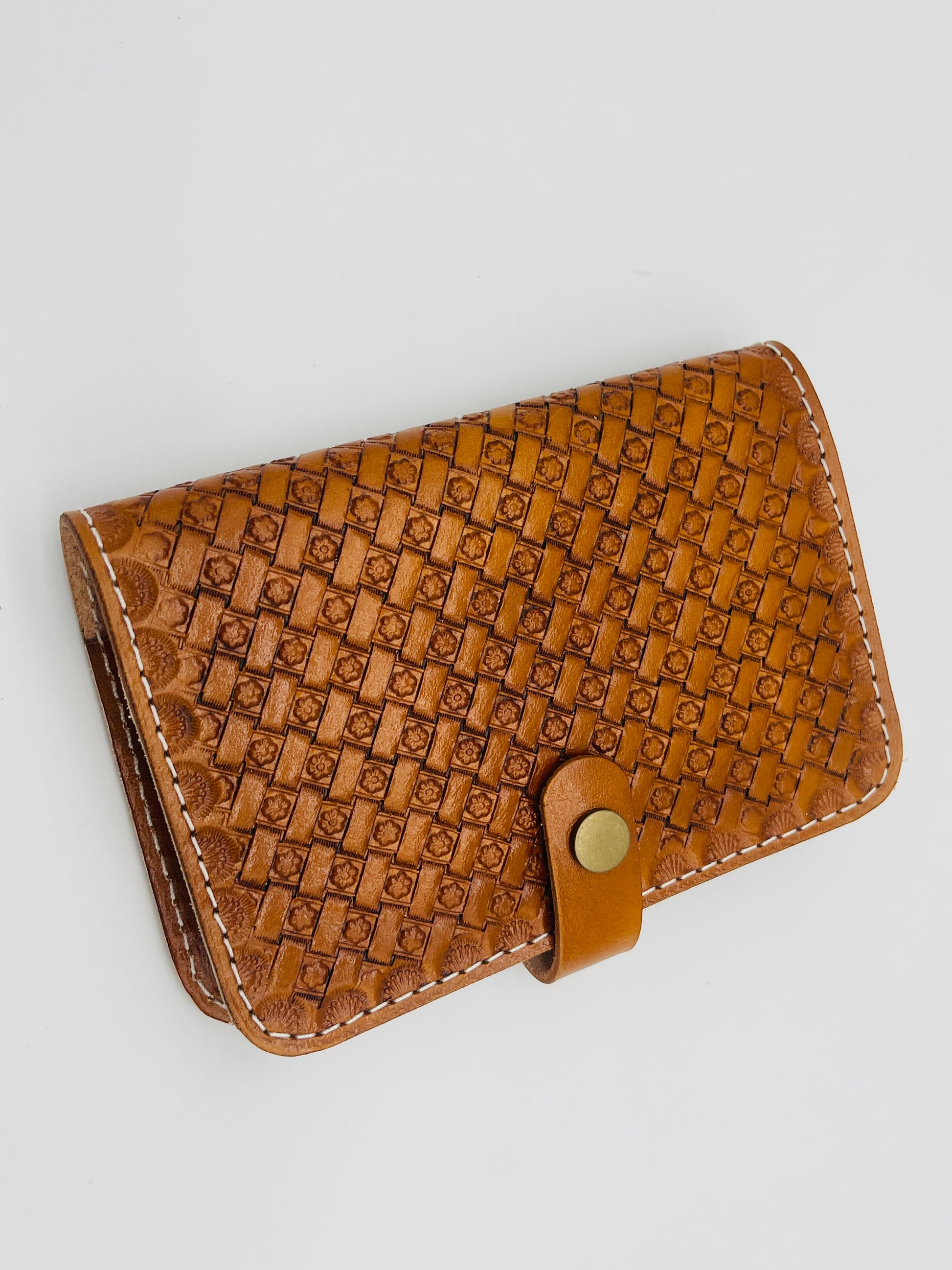 This is a beautiful leather notebook cover with a basketweave pattern and a snap closure. The intricate tooling and stitching give it a refined and handcrafted look.