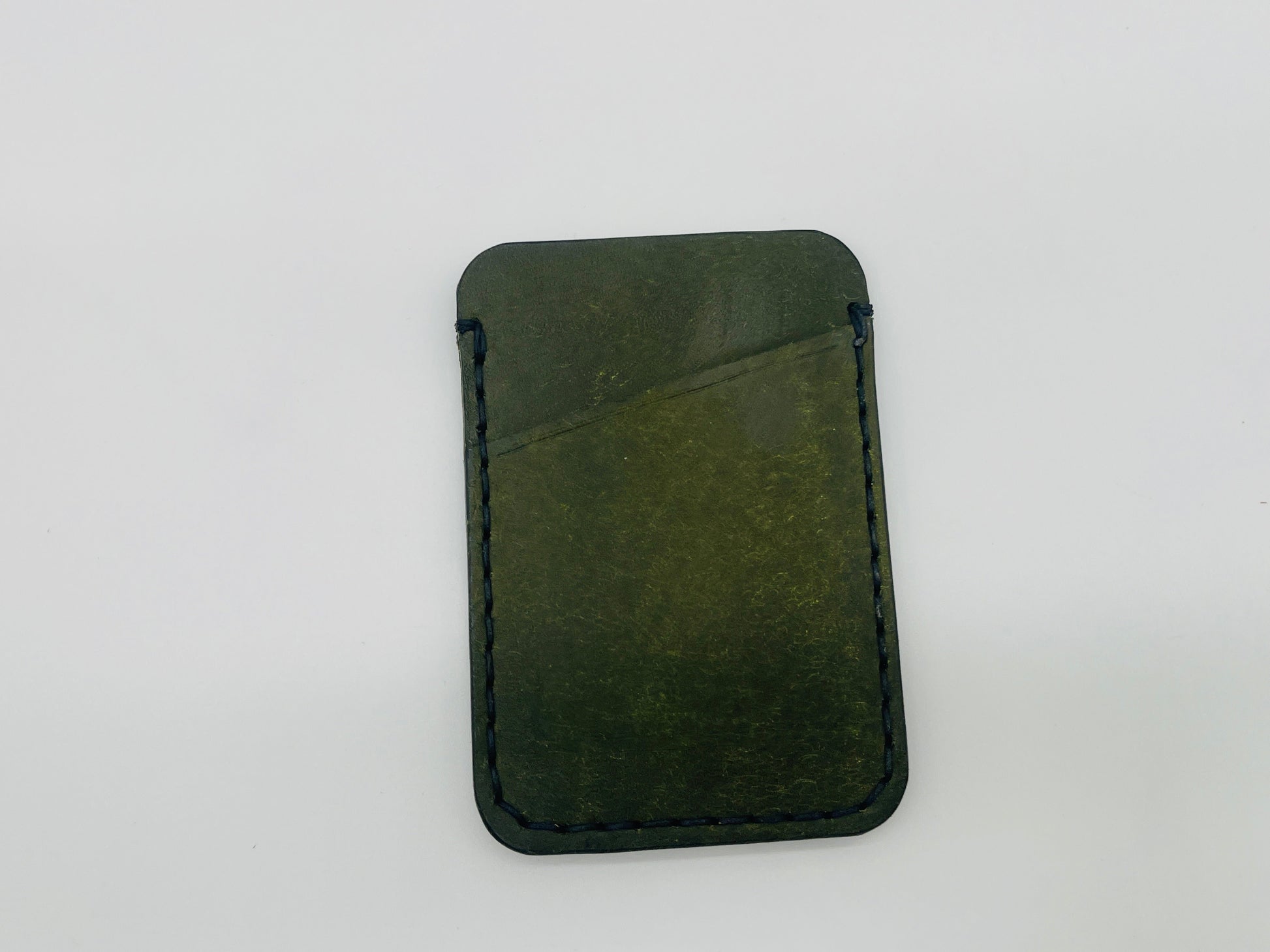 This leather card wallet features a deep, earthy green tone with a subtle, rustic texture. Its diagonal card slot design gives it a modern touch, while the white hand-stitched border provides a crisp contrast against the darker leather. Ideal for a minimalistic look, this wallet blends functionality with a unique, nature-inspired aesthetic.