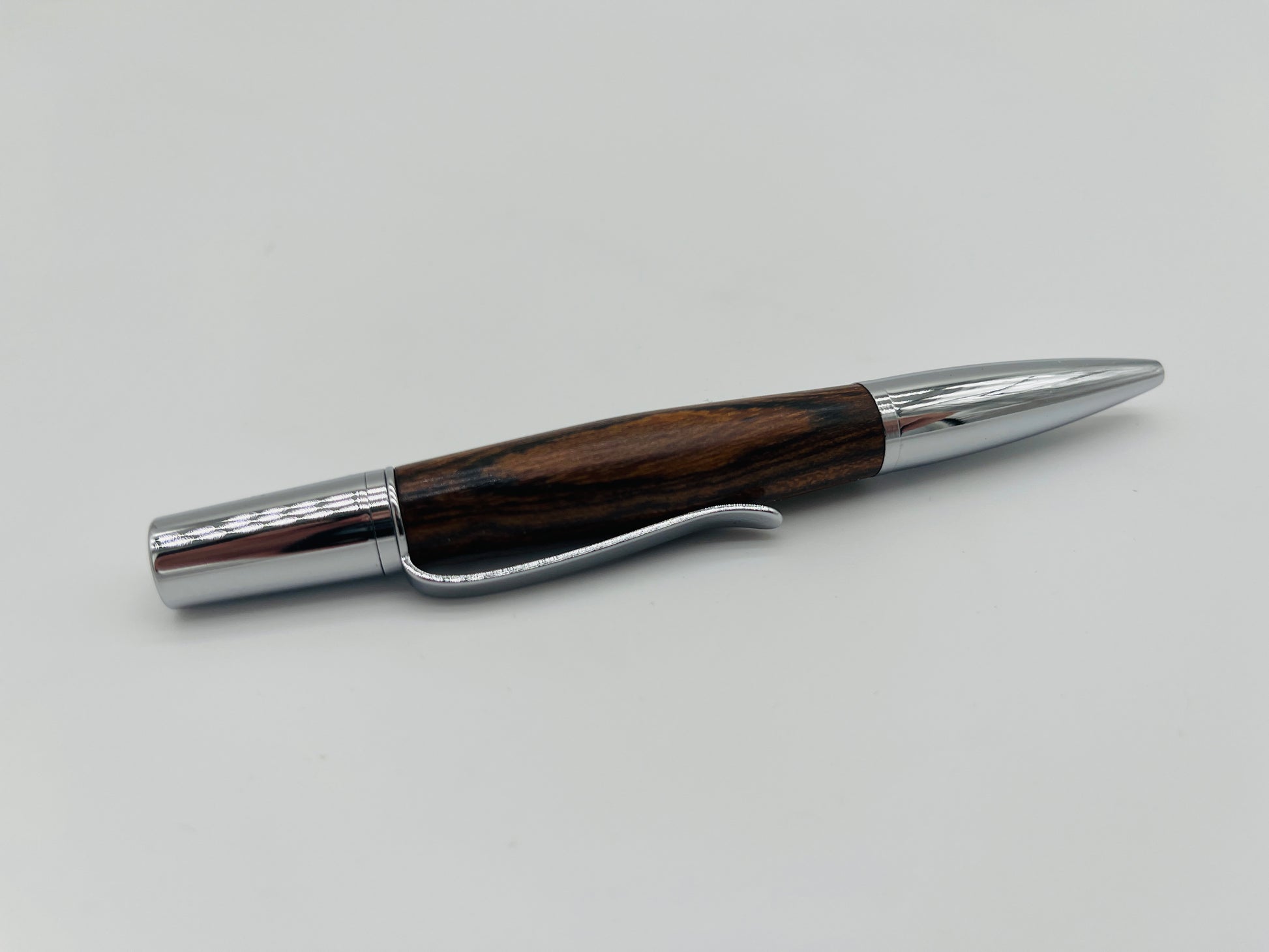 Experience the elegance of natural craftsmanship with this handcrafted Wenge wood pen. Known for its distinctive dark grain patterns, Wenge wood brings a rich, earthy character to this pen, beautifully complemented by sleek chrome accents. The combination of deep wood tones and polished metal creates a sophisticated and timeless look, ideal for professionals and enthusiasts alike. Perfectly balanced and smooth to write with, this pen is as functional as it is stylish. Add a touch of refinement to your writing collection or gift it to someone who appreciates the beauty of fine materials.