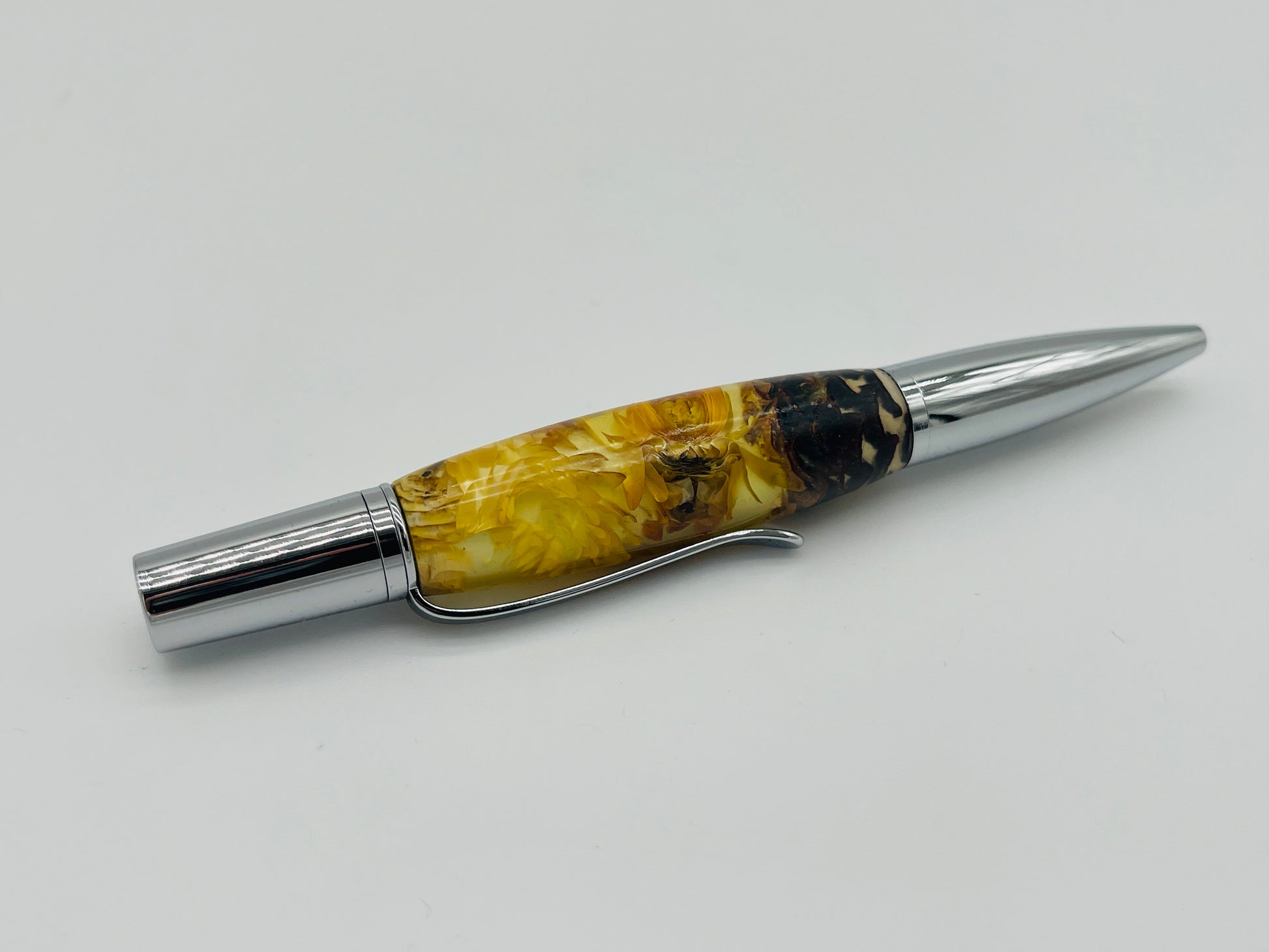 Experience the beauty of nature captured in this stunning handcrafted pen, featuring a unique resin body embedded with yellow flower petals. Each pen is a work of art, showcasing real botanical elements preserved in vibrant yellow and earthy tones, creating a warm, organic feel. The polished chrome accents add a touch of sophistication, balancing the natural beauty with a modern finish. Perfect for writers, artists, or collectors, this pen offers a smooth writing experience and a truly one-of-a-kind design. Gift it to someone special or add it to your collection for a touch of nature’s elegance in your everyday life.